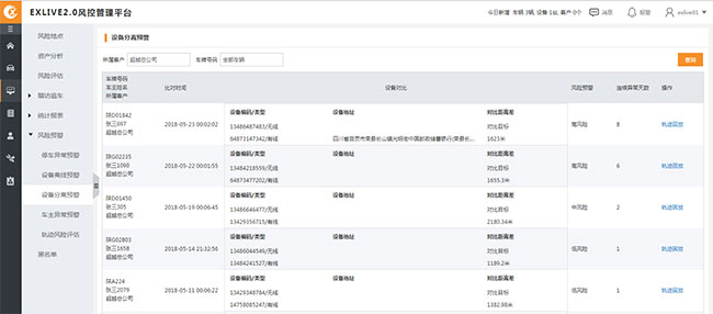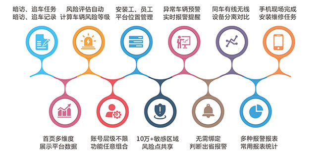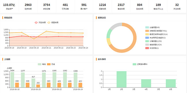 事前风险控制,事中风险控制,事后风险处置为主线解决车贷风控行业痛点问题;事前风险控制,通过信用评估模块实现多个维度查询车主信用,降低贷前风险;事中风险控制,实时监控、报警推送、资产分析、统计报表、风险预警、风险评估等功能达到平台自动判断风险车辆、实时报警推送、平台通过算法数据整理;事后风险处置,轨迹风险评估记录风险轨迹,追车事件记录。