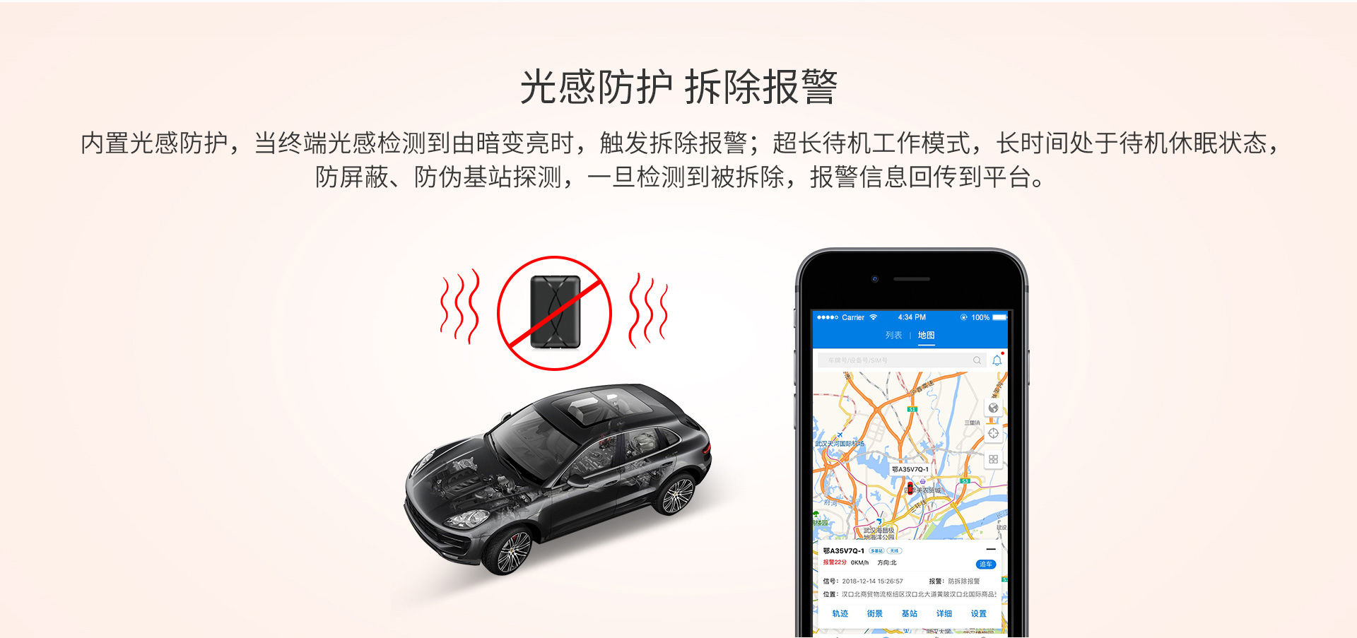 一款支持2/3/4G通信网络的超长待机终端 产品亮点:3年超长待机 免接线免安装 光感防拆 适用领域:车辆租赁、以租代购、P2P车抵贷、按揭车贷、银行担保抵押、融资租赁、企事业单位用车、私家车车贷管理、贵重物流运输、货物追踪等相关行业。 可以实时查看重点关注车辆,风险车辆,车辆报警状况:分离报警、拆除报警、二押点报警、异常停留等。